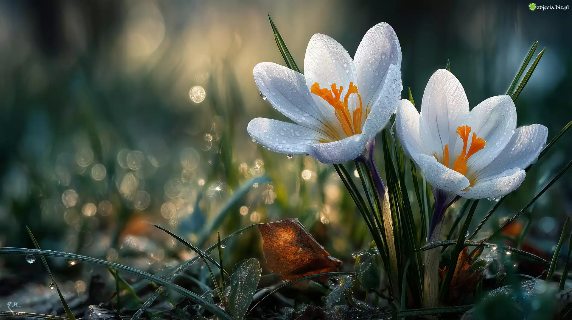 Zdjęcie Białe, Krokusy, Kwiaty, Trawa, Krople, Grafika AI