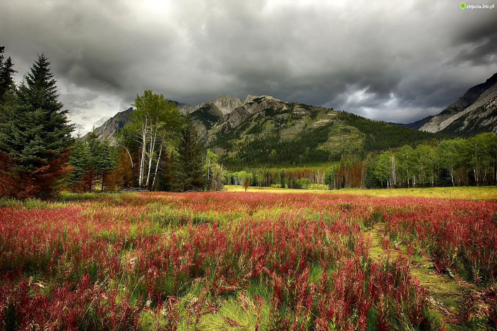 Zdjęcie, Kwitnąca Trawa, łąka, Las, Góry, Zachmurzone Niebo