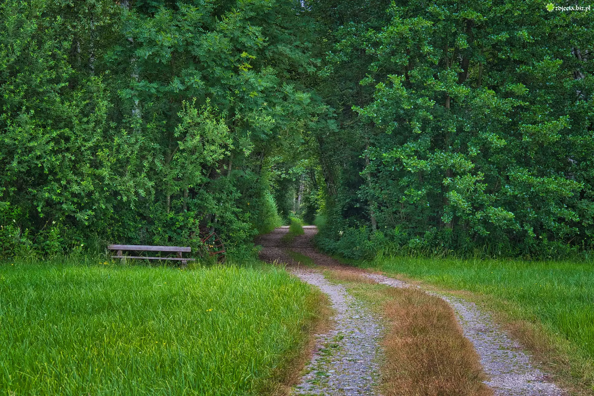 Zdjęcie Ławka, Trawa, Las, Ścieżka, Drzewa