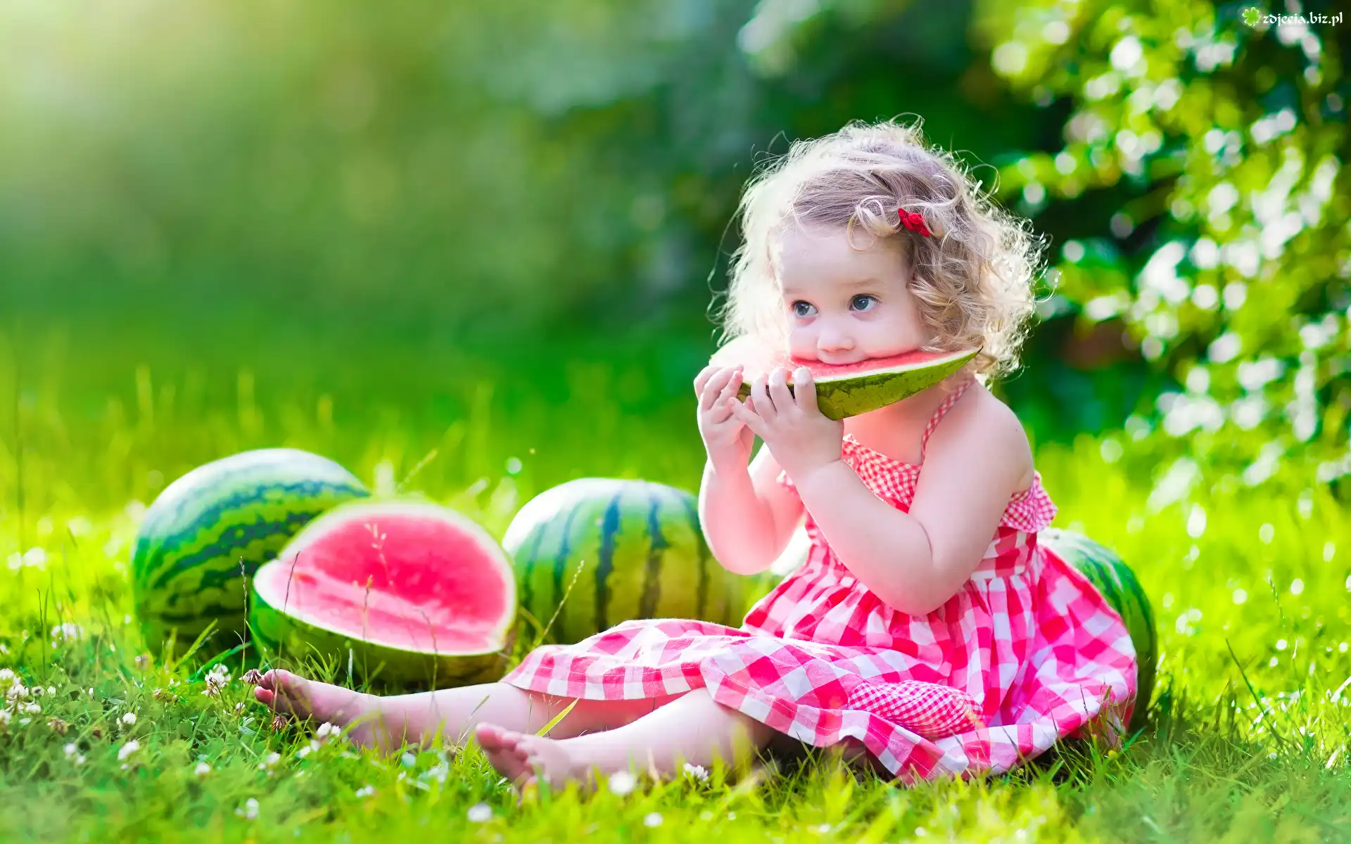 Zdjęcie Arbuzy, Trawa, Mała, Dziewczynka, Sukienka