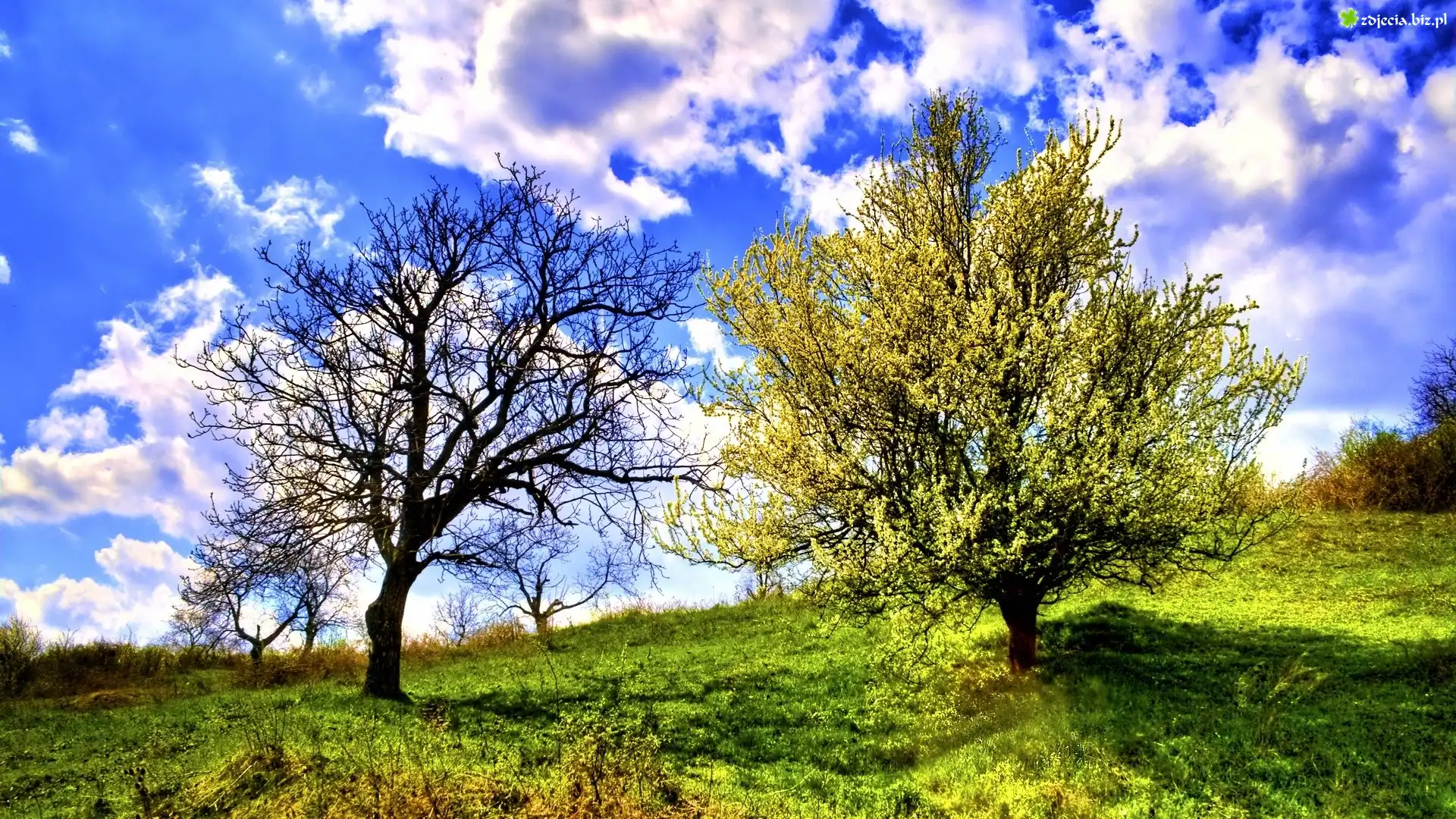 Zdjęcie Trawa, Łąka, Drzewa, Niebo, Chmury