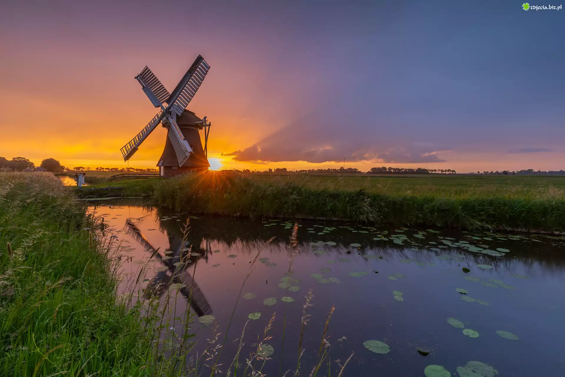 Zdjęcie Wiatrak, Rzeka, Pole, Trawa, Niebo, Zachód Słońca