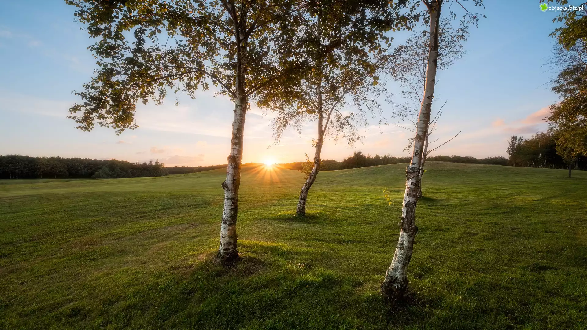 Zdjęcie Pole, Drzewa, Brzozy, Trawa, Promienie słońca