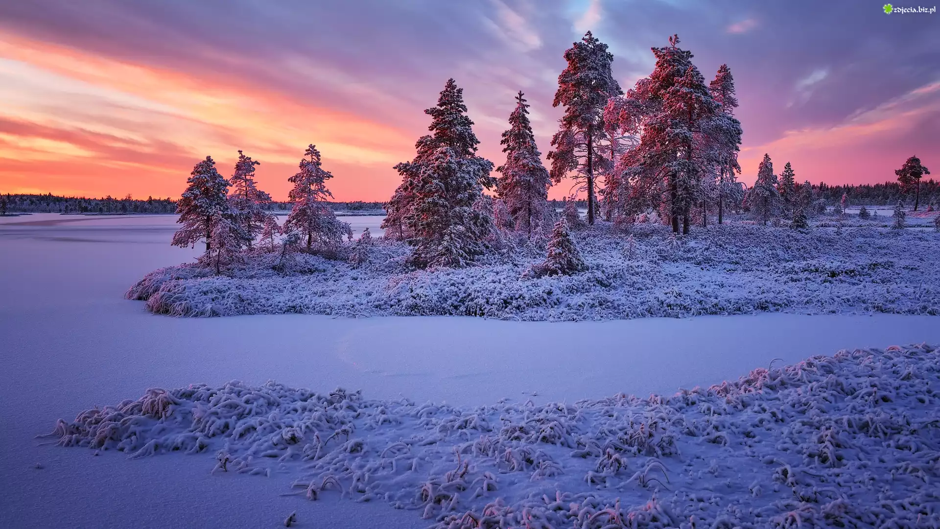 Zdjęcie Zima, Drzewa, Ośnieżone, Trawa