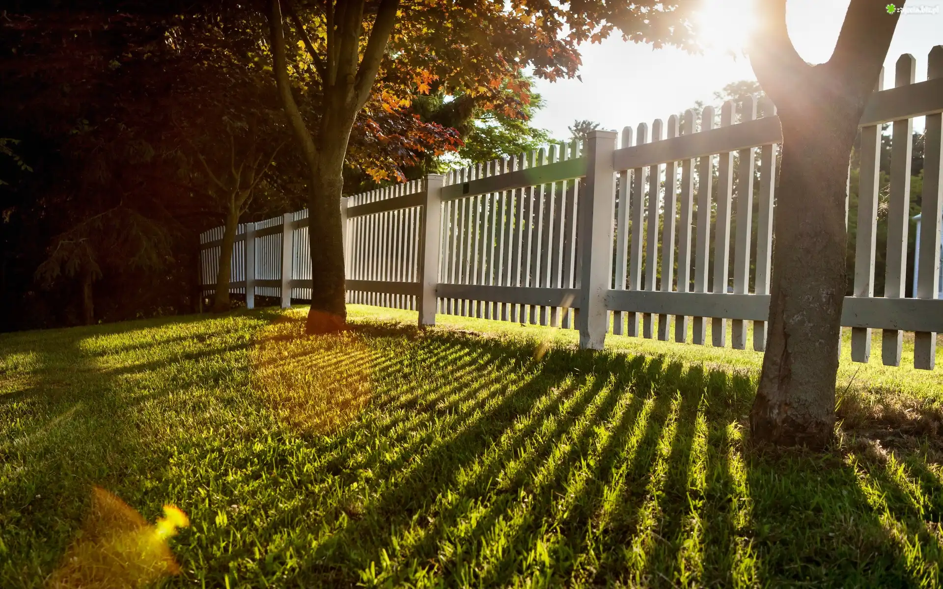 Zdjęcie Trawnik, Drzewa, Płot, Przebijające, Światło