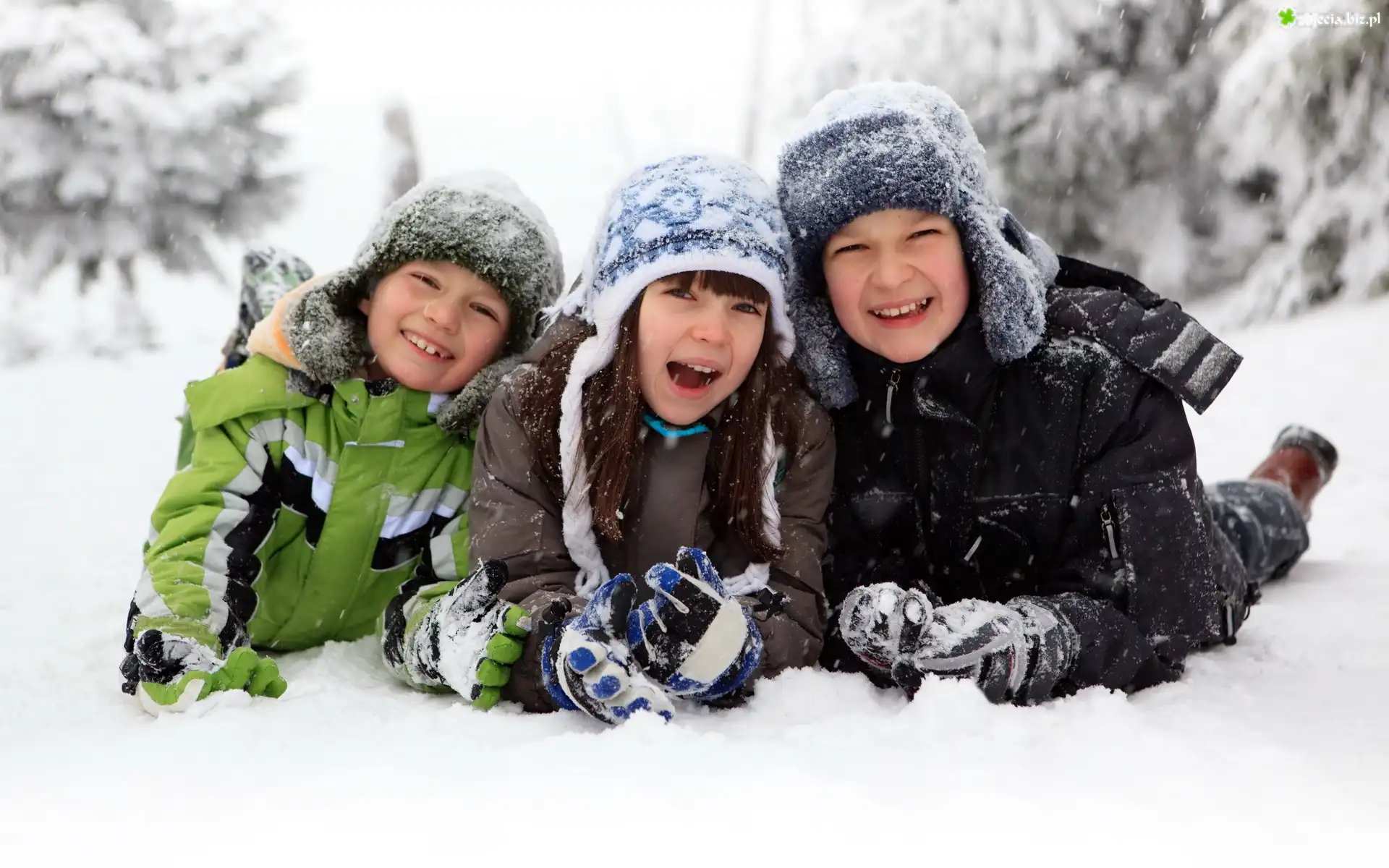 Zdjęcie Troje, Dzieci, Zima, Śnieg, Zabawa