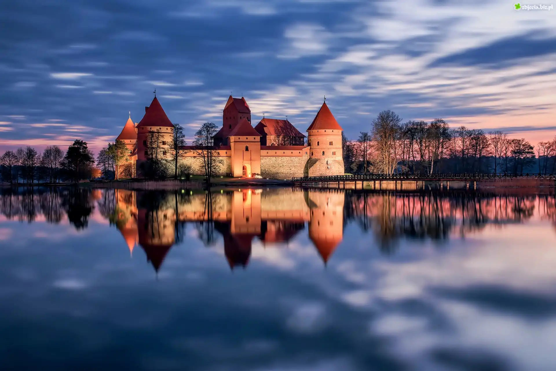 Zdjęcie Zamek w Trokach, Litwa, Troki, Jezioro, Most, Drzewa, Wschód Słońca