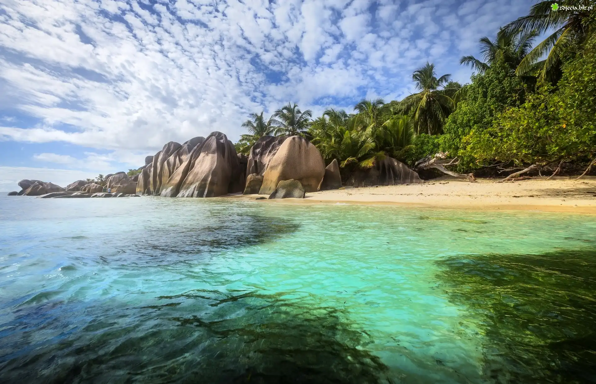 Zdjęcie Tropiki, Morze, Skały, Palmy, Plaża