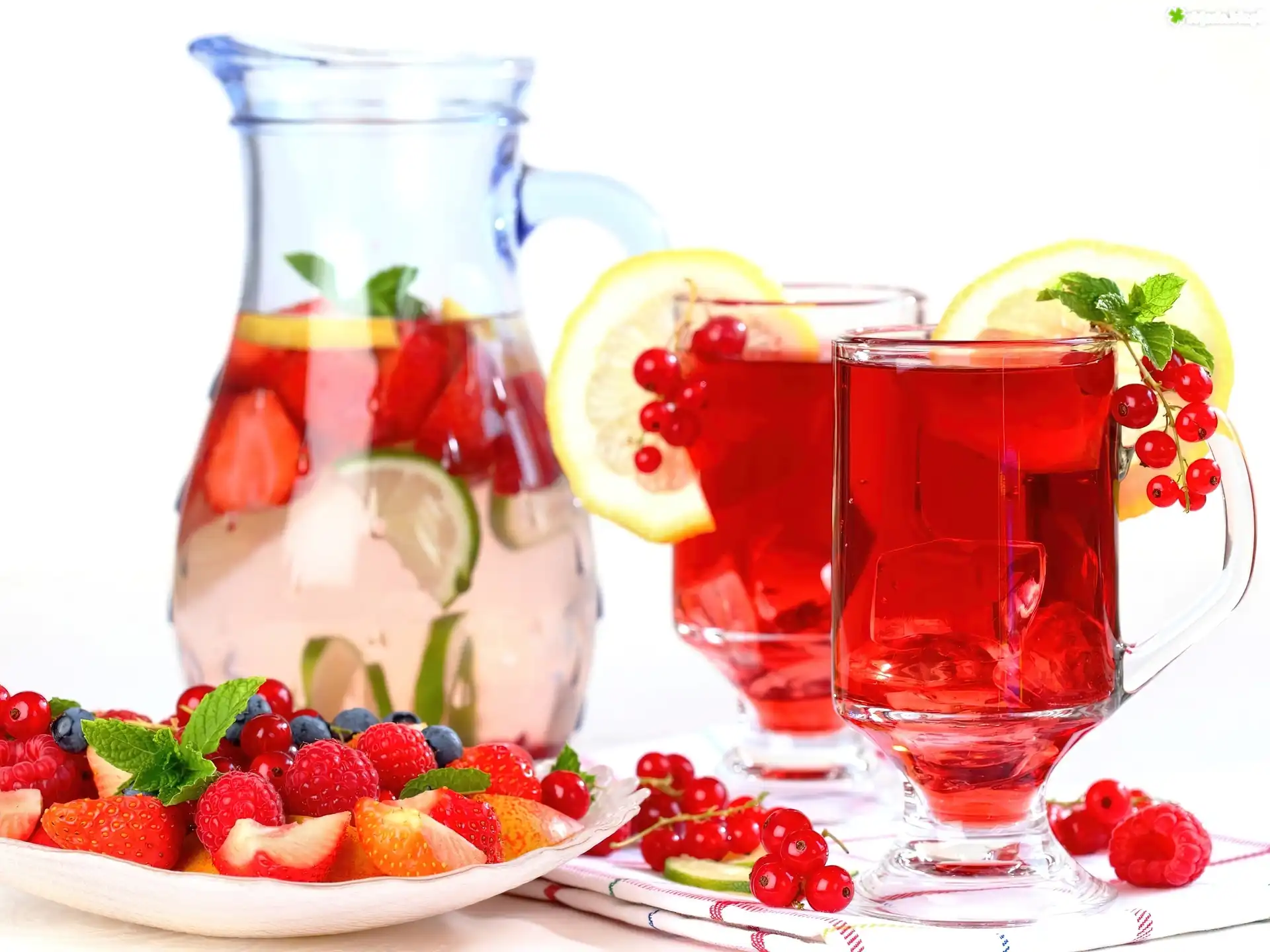 Zdjęcie Sok, Owocowy, Truskawki, Porzeczki, Jagody, Cytryna, Dzbanek, Szklanki, Owoce