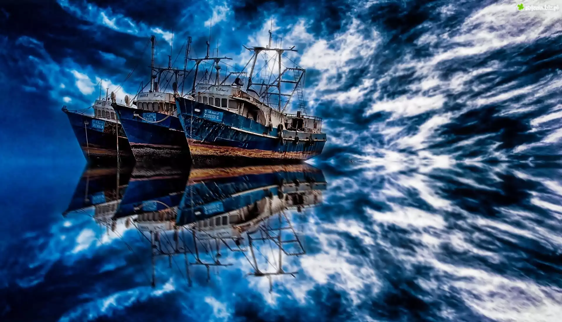 Zdjęcie Trzy, Statki, Morze, Niebo, Odbicie