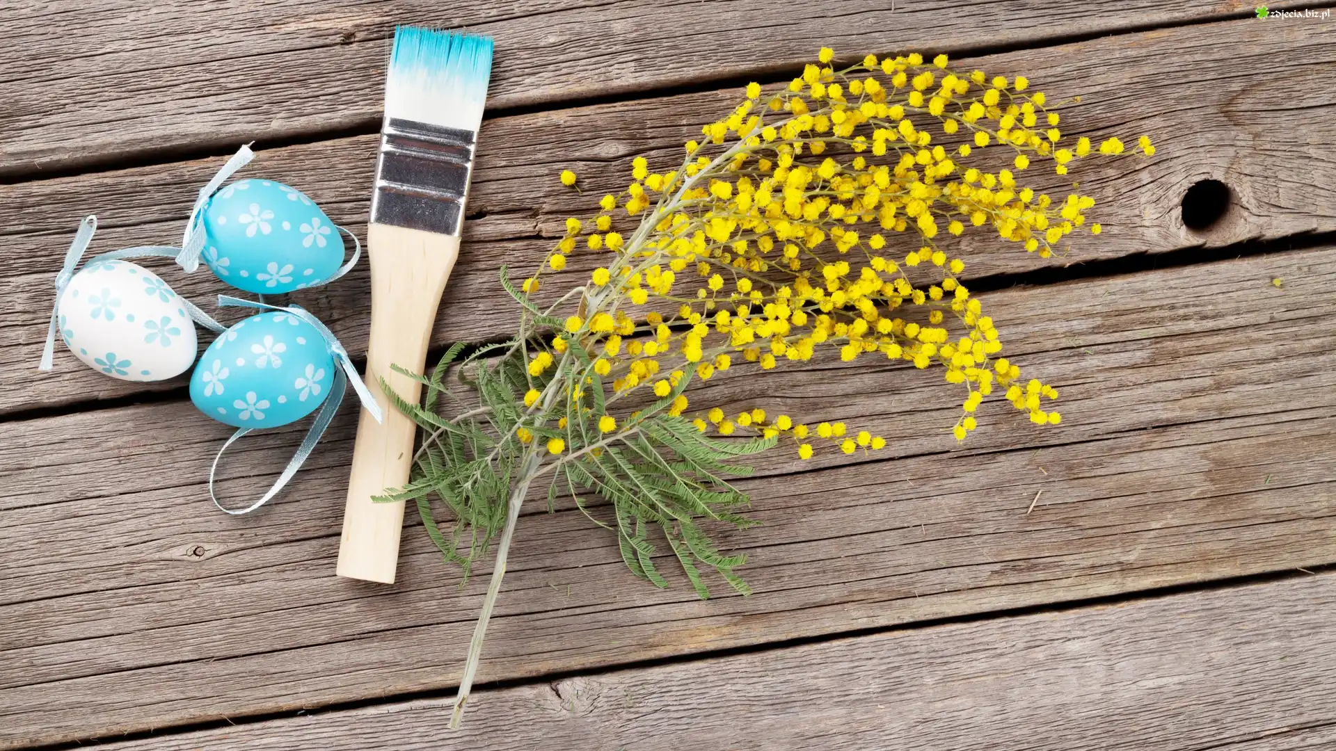 Zdjęcie Wielkanoc, Trzy, Pisanki, Gałązka, Żółte, Kwiatki, Deski, Pędzel