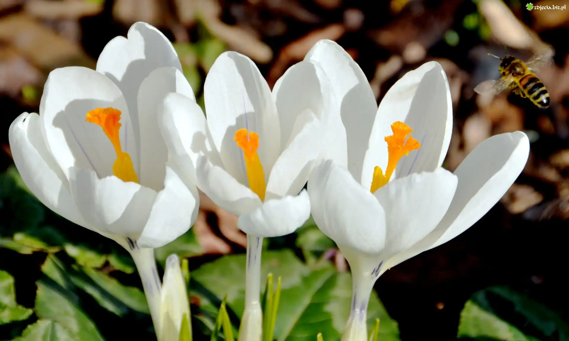 Zdjęcie Trzy, Białe, Krokusy, Pszczoła, Makro