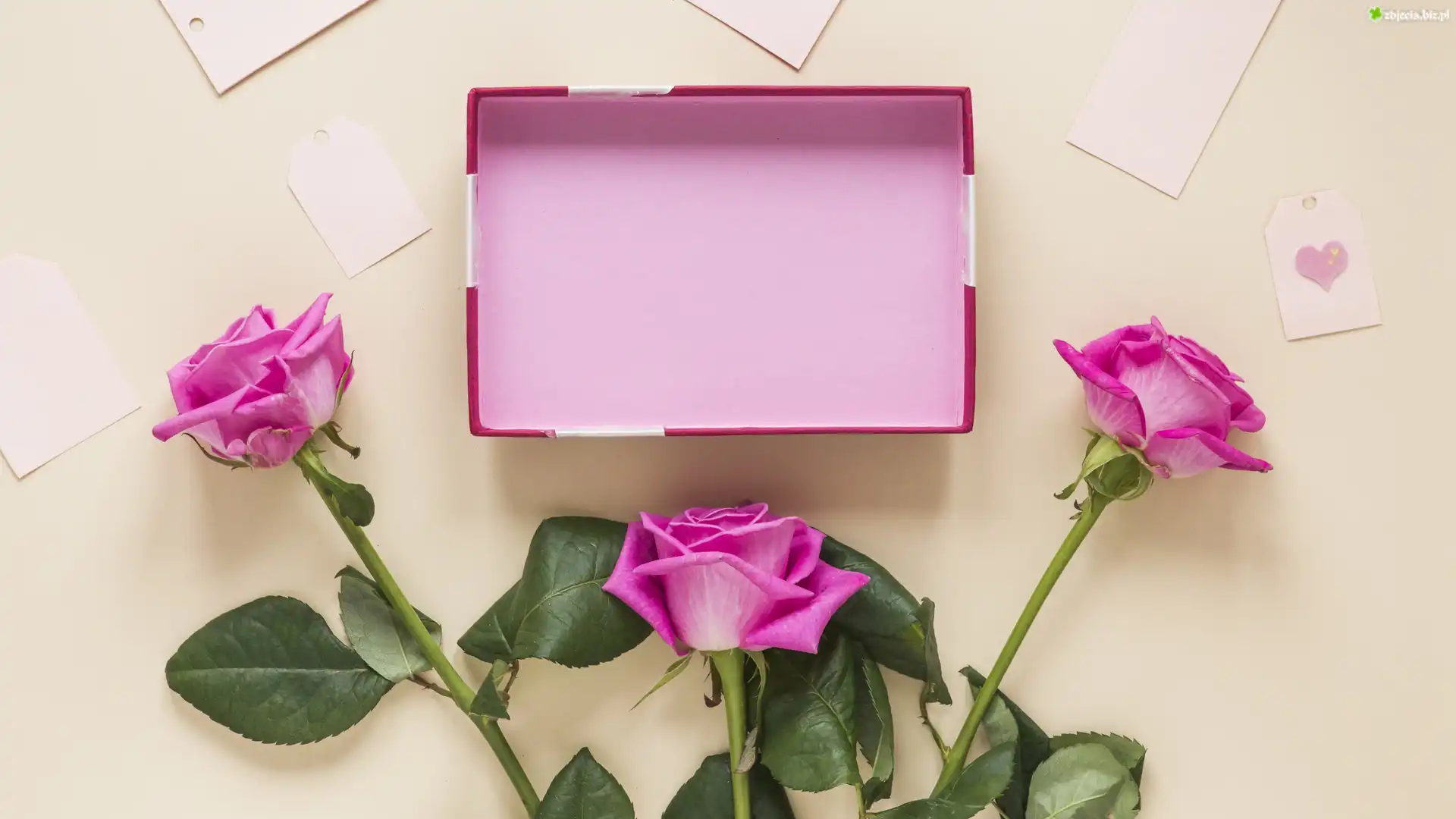 Zdjęcie Trzy, Różowe, Róże, Pudełko, Serduszko