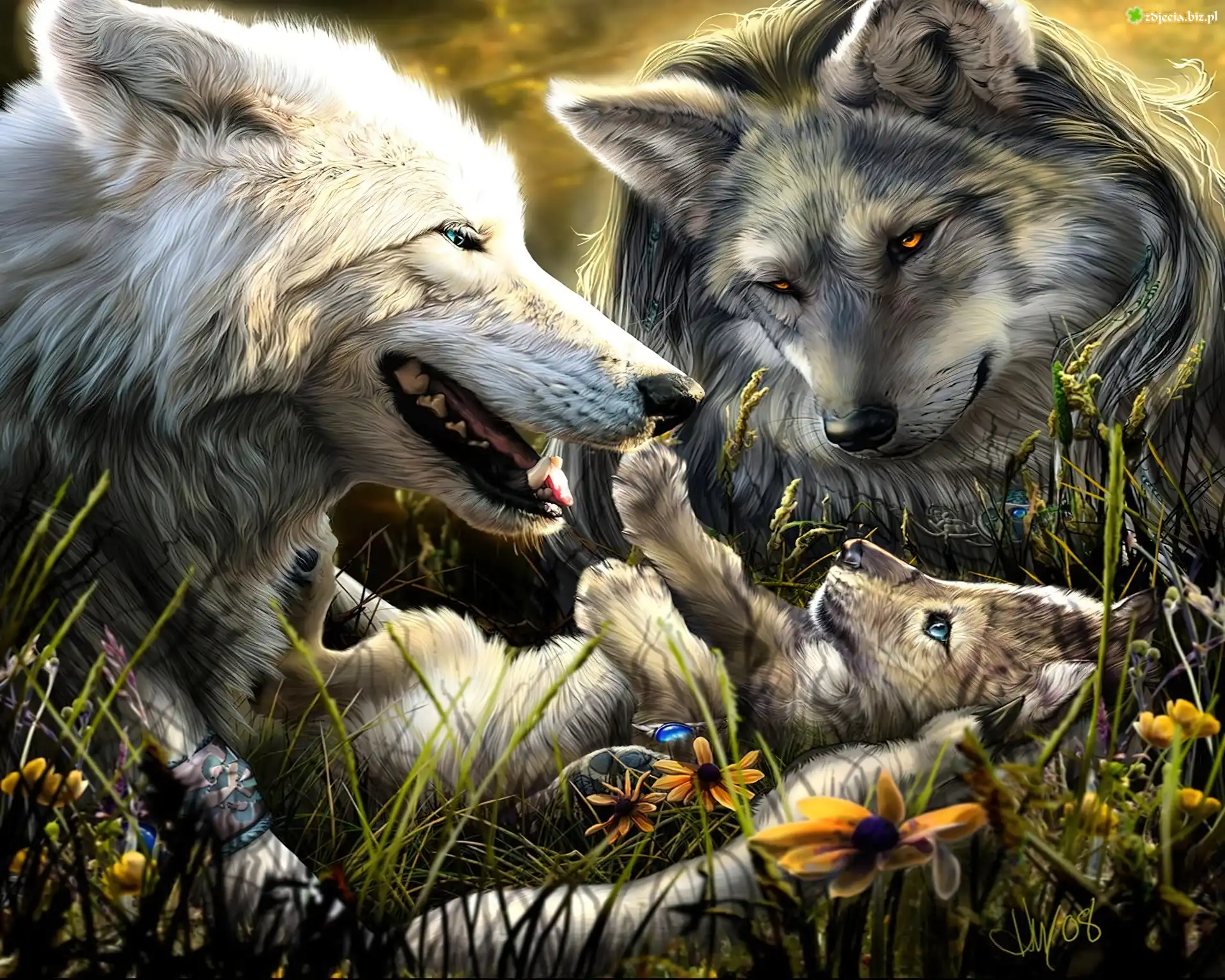 Zdjęcie Trzy, Wilki, Rodzina, Łąka