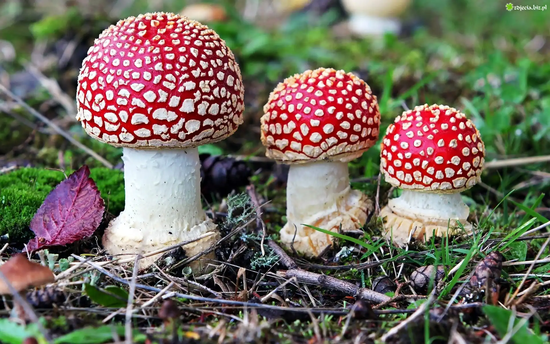 Zdjęcie Trzy, Muchomory, Liście, Trawa, Igły