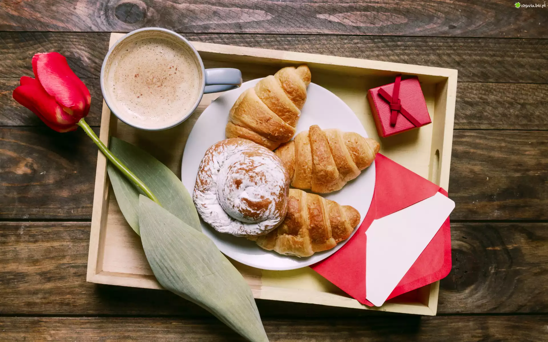 Zdjęcie, Walentynki, Tulipan, Kawa, Rogaliki, Koperta, List, Prezencik