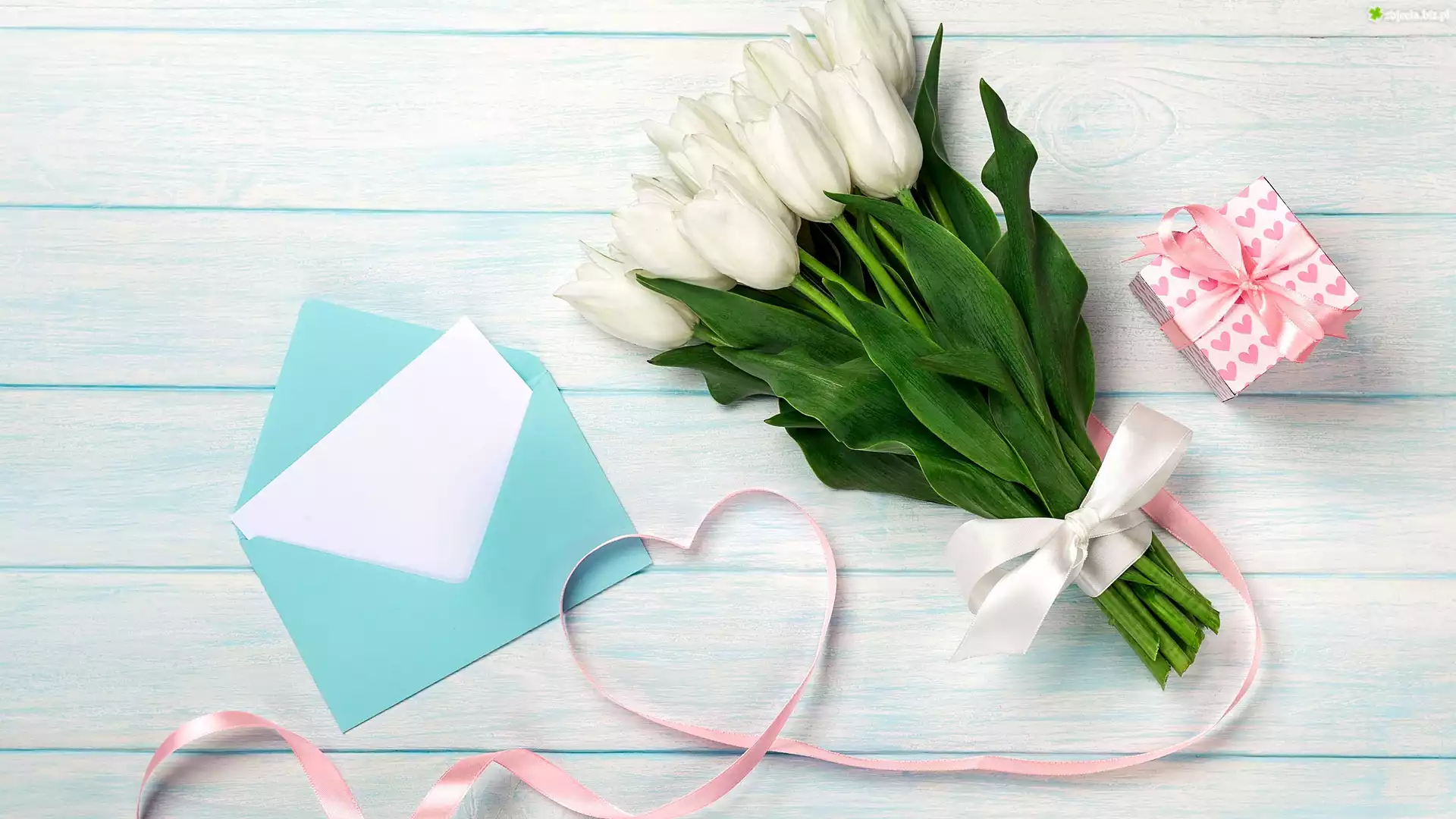 Zdjęcie Białe, Tulipany, Prezent, Niebieska, Koperta, Kartka, Wstążki
