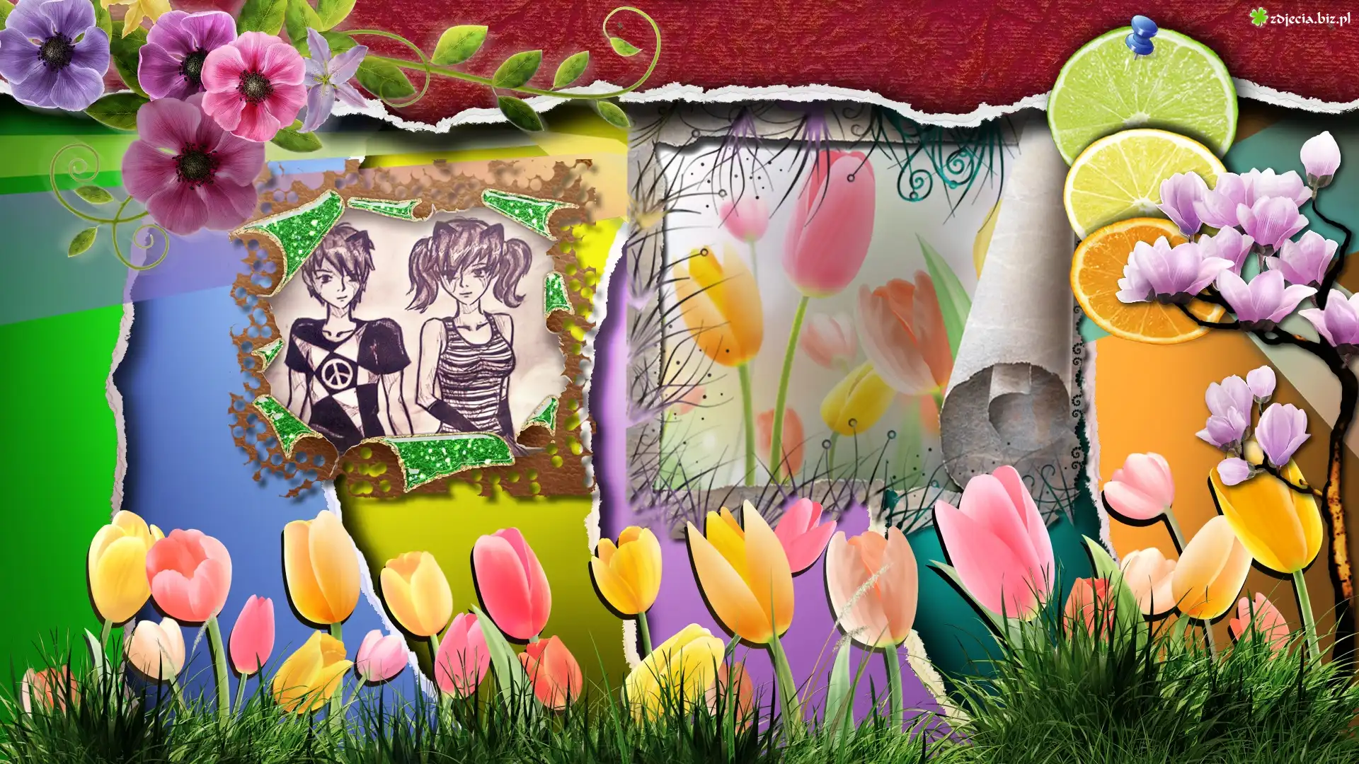 Zdjęcie Tulipany, Trawa, Kwiaty, Cytryna, Pomarańcz