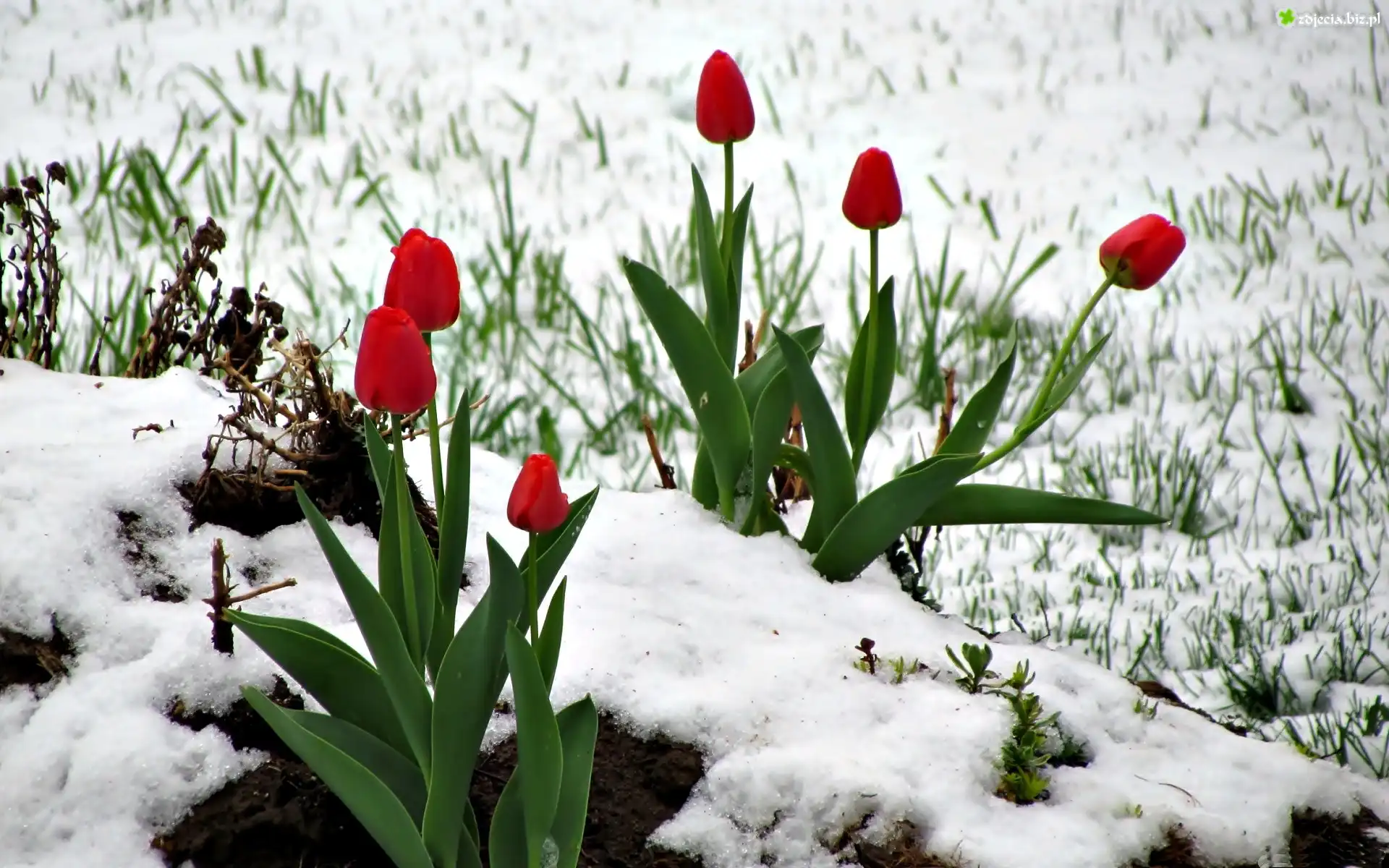 Zdjęcie Czerwone, Tulipany, Śnieg