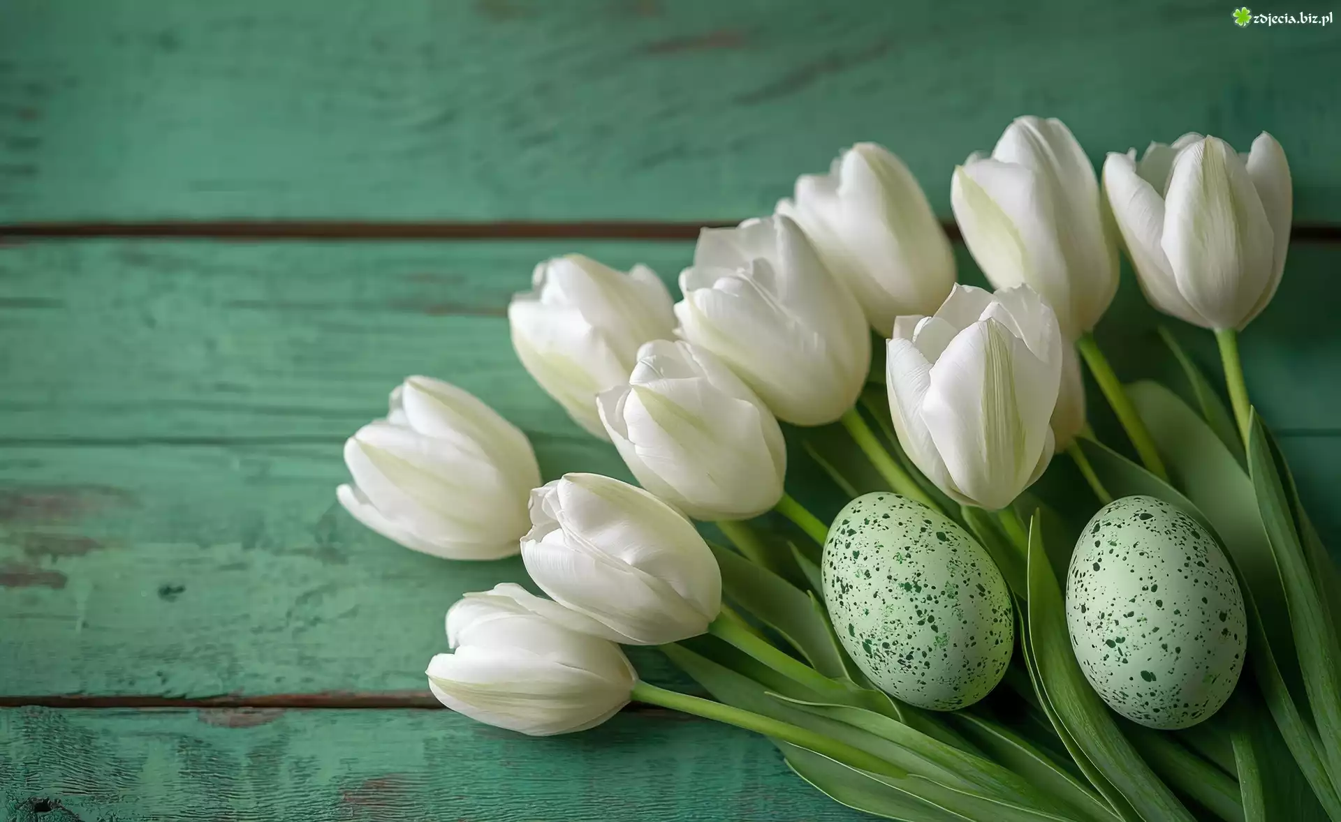Zdjęcie Wielkanoc, Pisanki, Białe, Tulipany, Zielone, Deski