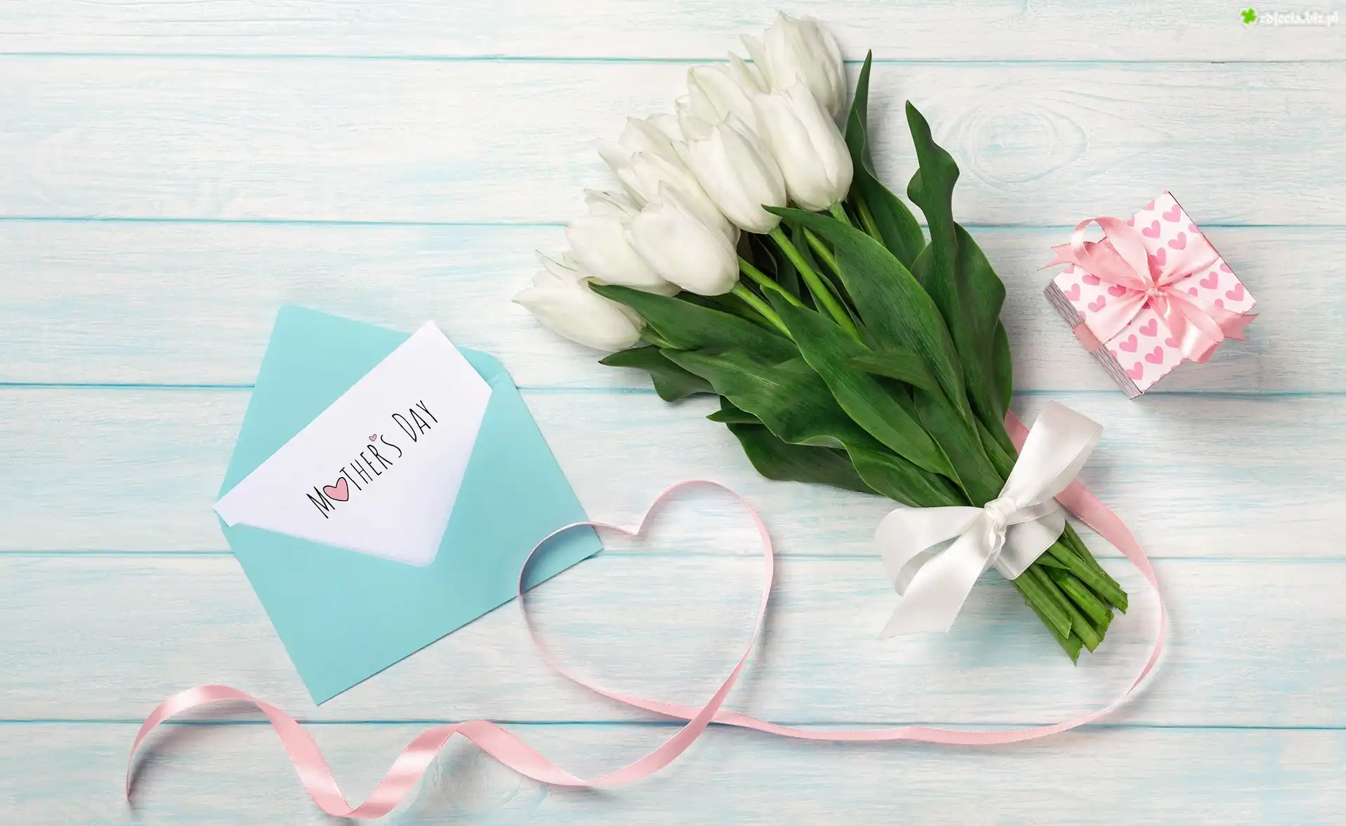 Zdjęcie Białe, Kwiaty, Tulipany, Prezent, Niebieska, Koperta, Kartka, Napis, Dzień Matki, Wstążki |