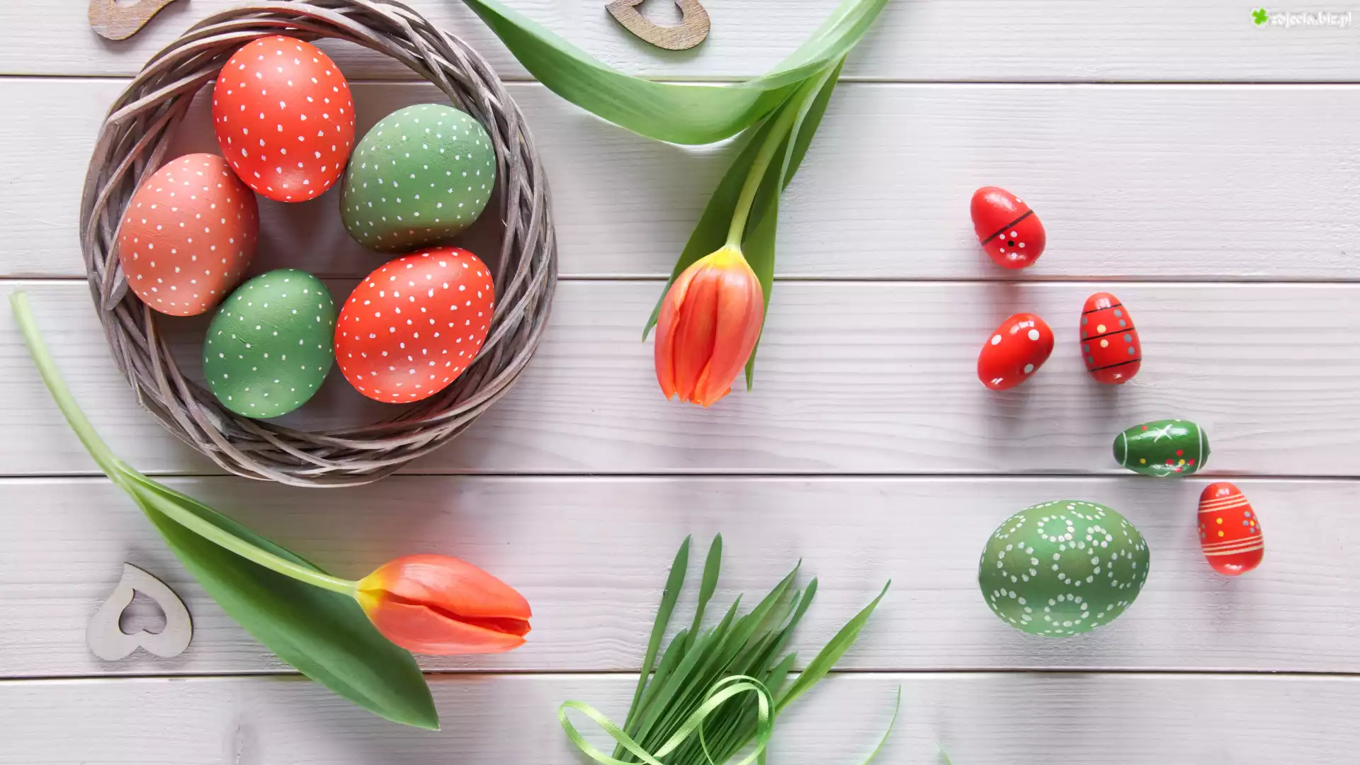 Zdjęcie, Wielkanoc, Tulipany, Pisanki, Jasne, Deski