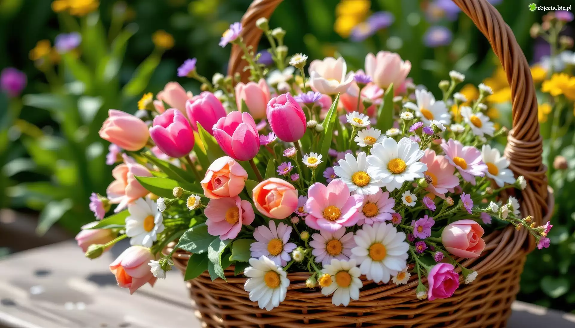 Zdjęcie Kwiaty, Tulipany, Stokrotki, Wiklinowy, Koszyk