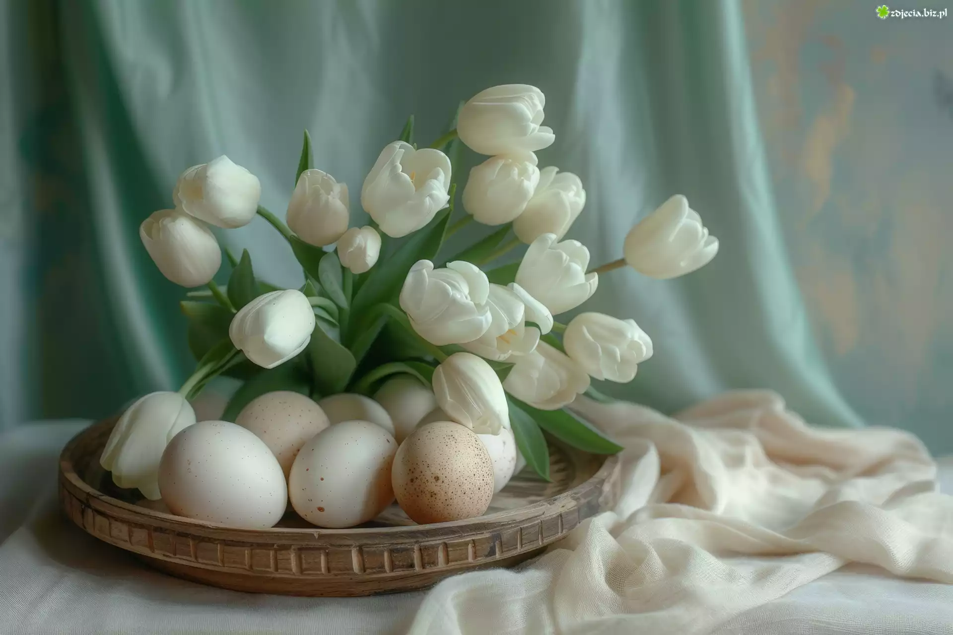 Zdjęcie Wielkanoc, Jajka, Białe, Tulipany, Taca, Tkanina