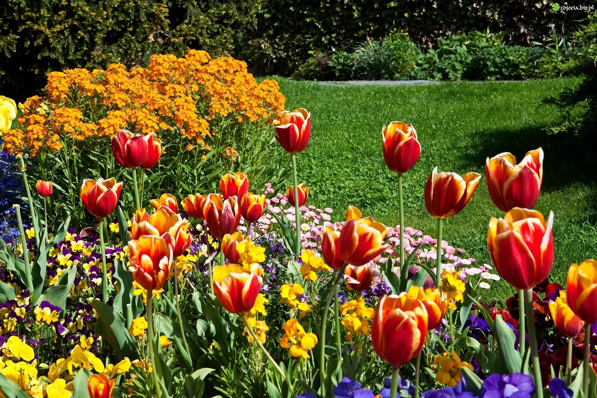 Zdjęcie Tulipany, Kolorowe, Kwiaty, Trawnik, Park