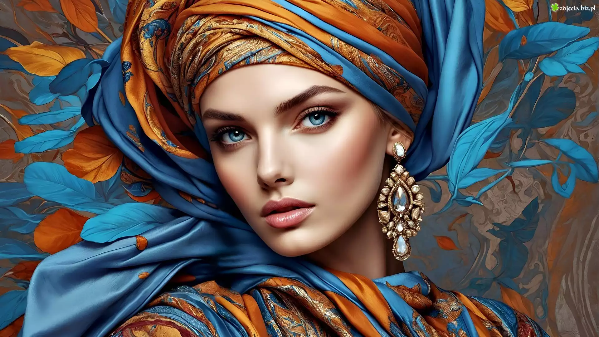 Zdjęcie Kobieta, Turban, Materiał, Kolczyk, Grafika