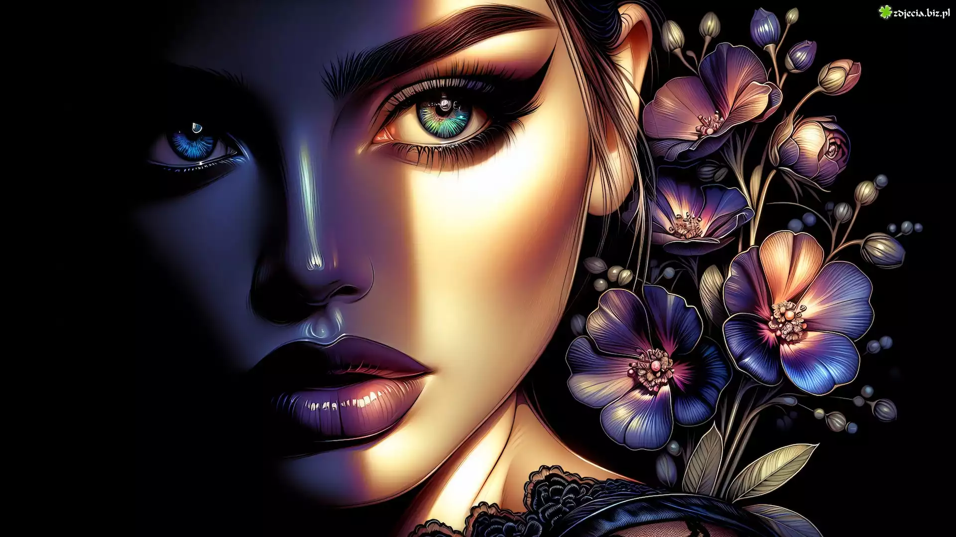 Zdjęcie Kobieta, Twarz, Makijaż, Kwiaty, Grafika
