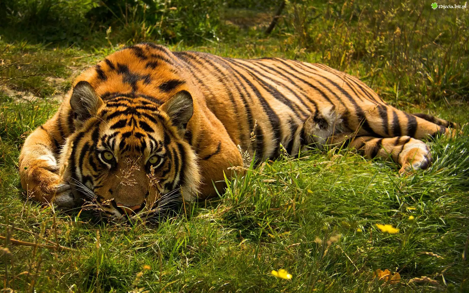 Tygrys, Kładka Tygrys, Zielone, Oczy Leżący, Tygrys Tygrysy, Albinosy, Skała Tygrys, Zdobycz Tygrys, Głowa, Mrok Tygrysy Tygrys Tygrysica, Język, Młode Tygrys, Niebieskie, Tło Tygrys, Skok, Śnieg Tygrys Dwa, Tygrysy tygrysiątka