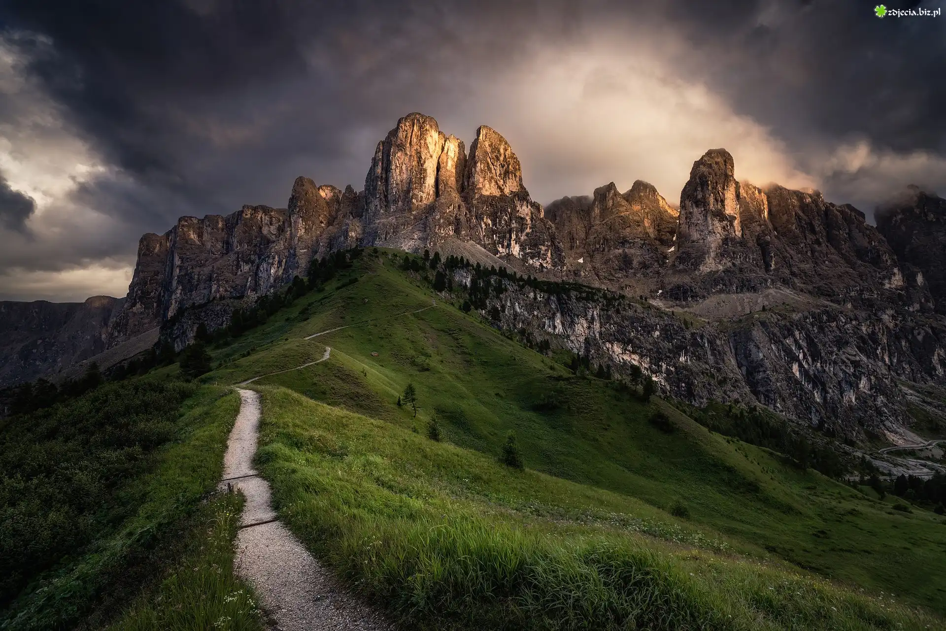 Zdjęcie, Włochy, Południowy Tyrol, Alpy, Dolomity, Przełęcz Gardena Pass, Góry Sella, Ścieżka