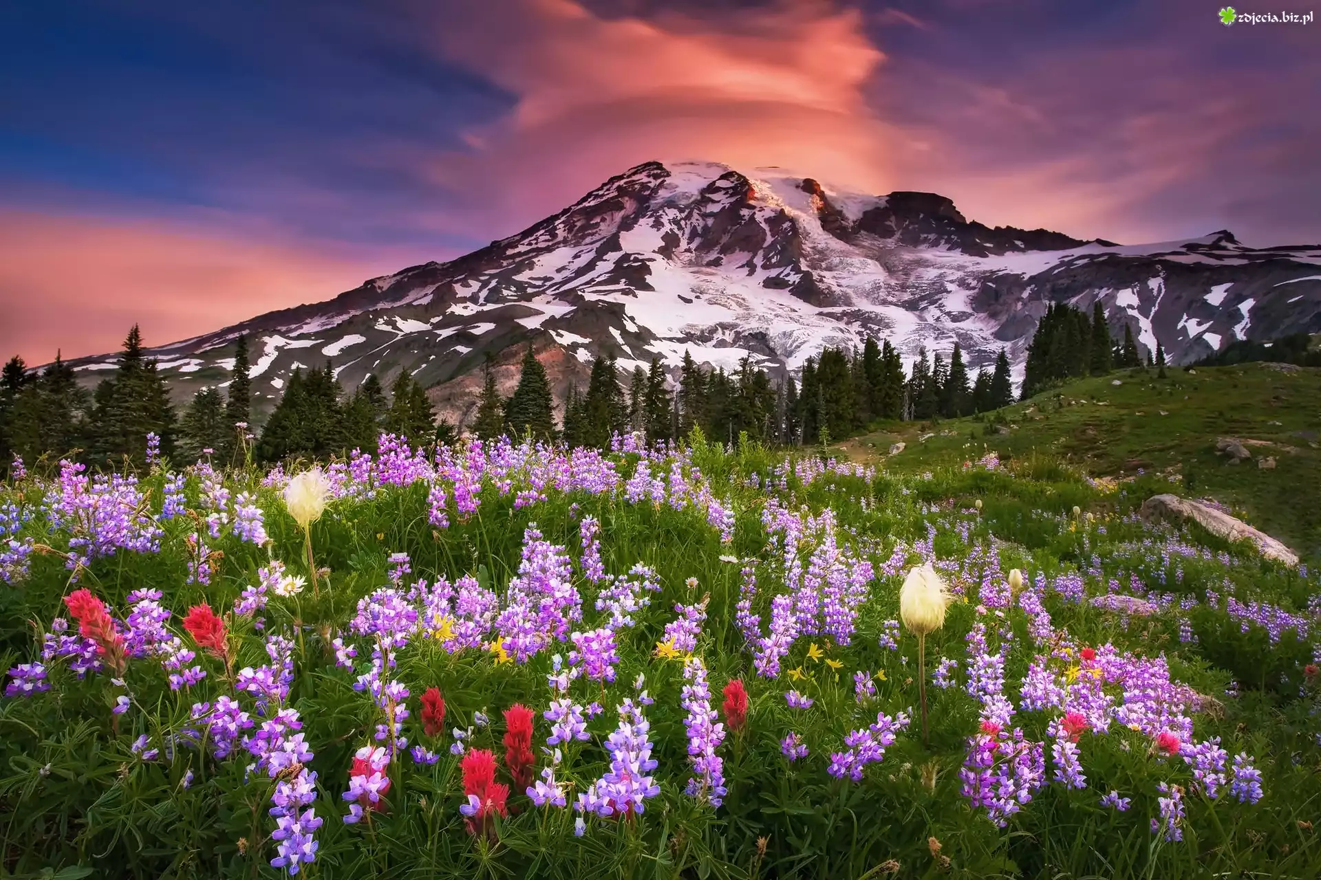 Zdjęcie, Stany Zjednoczone, Stan Waszyngton, Góry Mount Rainier, Łąka, Łubin