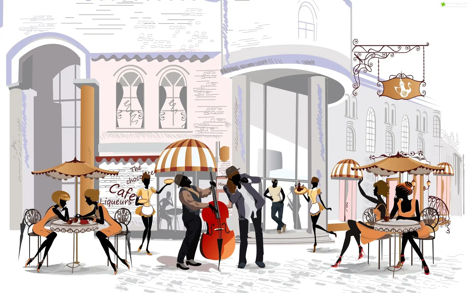 Zdjęcie Ulica, Kawiarnia, Muzycy, Grafika, 2D