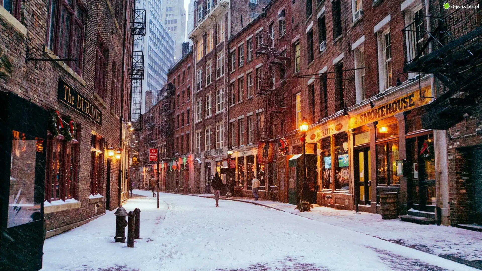 Zdjęcie Wieżowce, Ulica, Sklepy, Zima, Manhattan, Nowy, Jork, USA