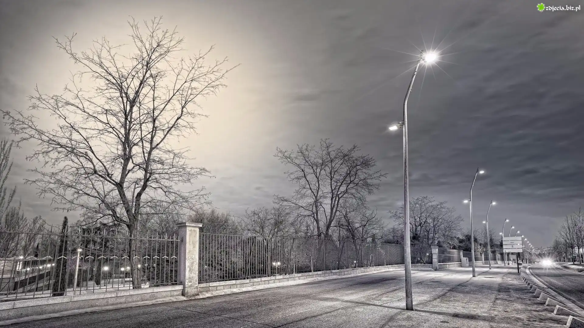 Zdjęcie, Ulica, Ogrodzenie, Latarnie, Wieczór, Drzewa