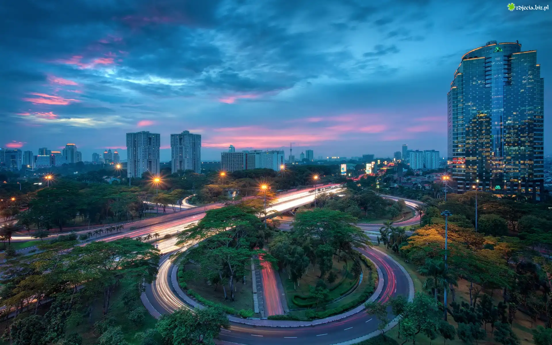 Zdjęcie, Wieżowce, Ulice, Drzewa, Dżakarta, Stolica, Jndonezji, Zachód, Słonca