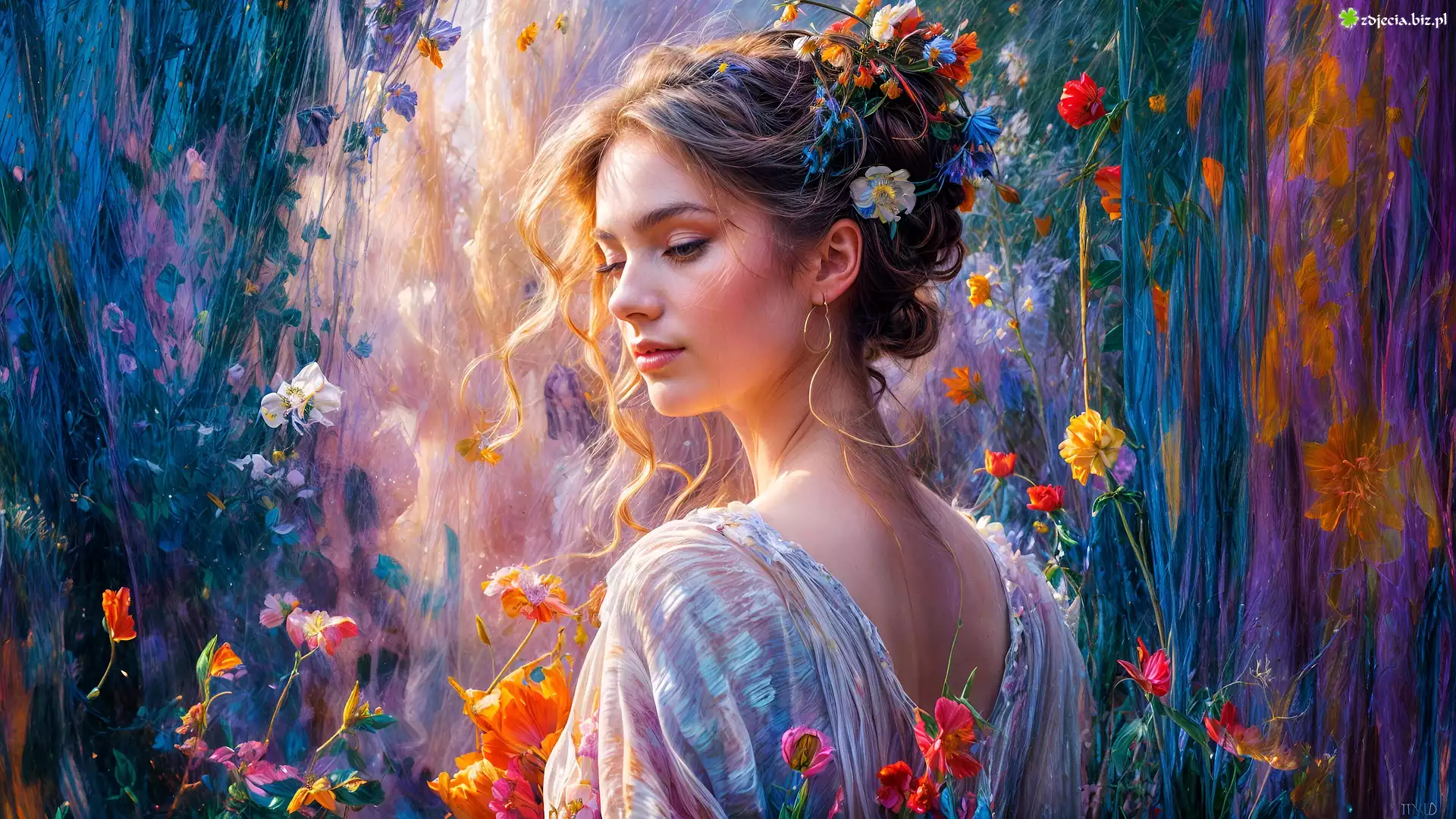 Zdjęcie Kobieta, Upięte, Włosy, Kwiaty, Grafika