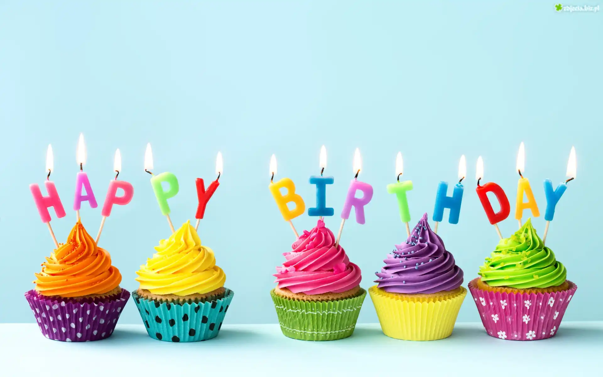 Zdjęcie Urodziny, Napisy, Świeczki, Kolorowe, Babeczki, Krem