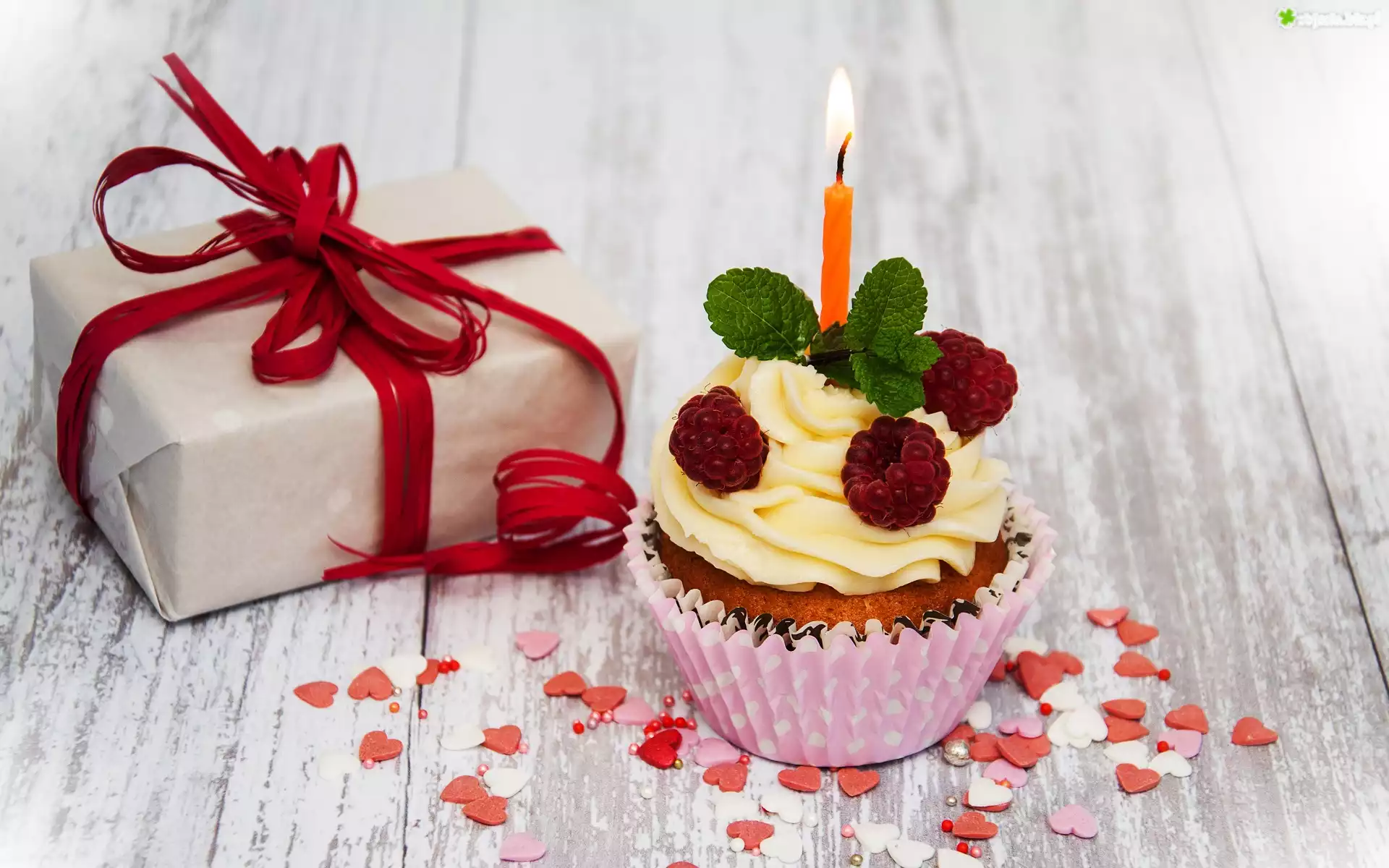 Zdjęcie Urodziny, Prezent, Babeczka, Maliny, Świeczka, Serduszka