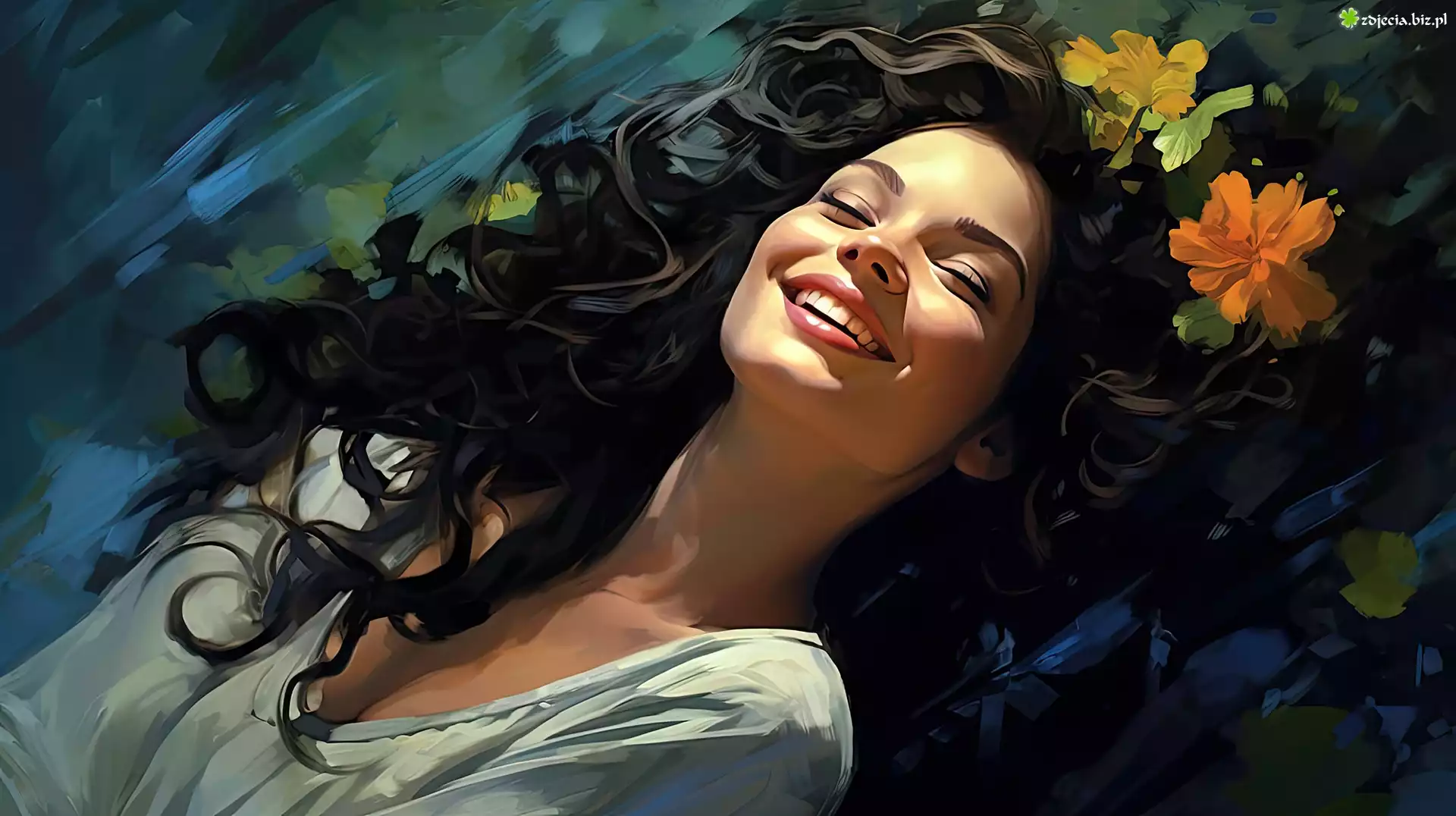 Zdjęcie Kobieta, Uśmiech, Kwiaty, Włosy, Grafika