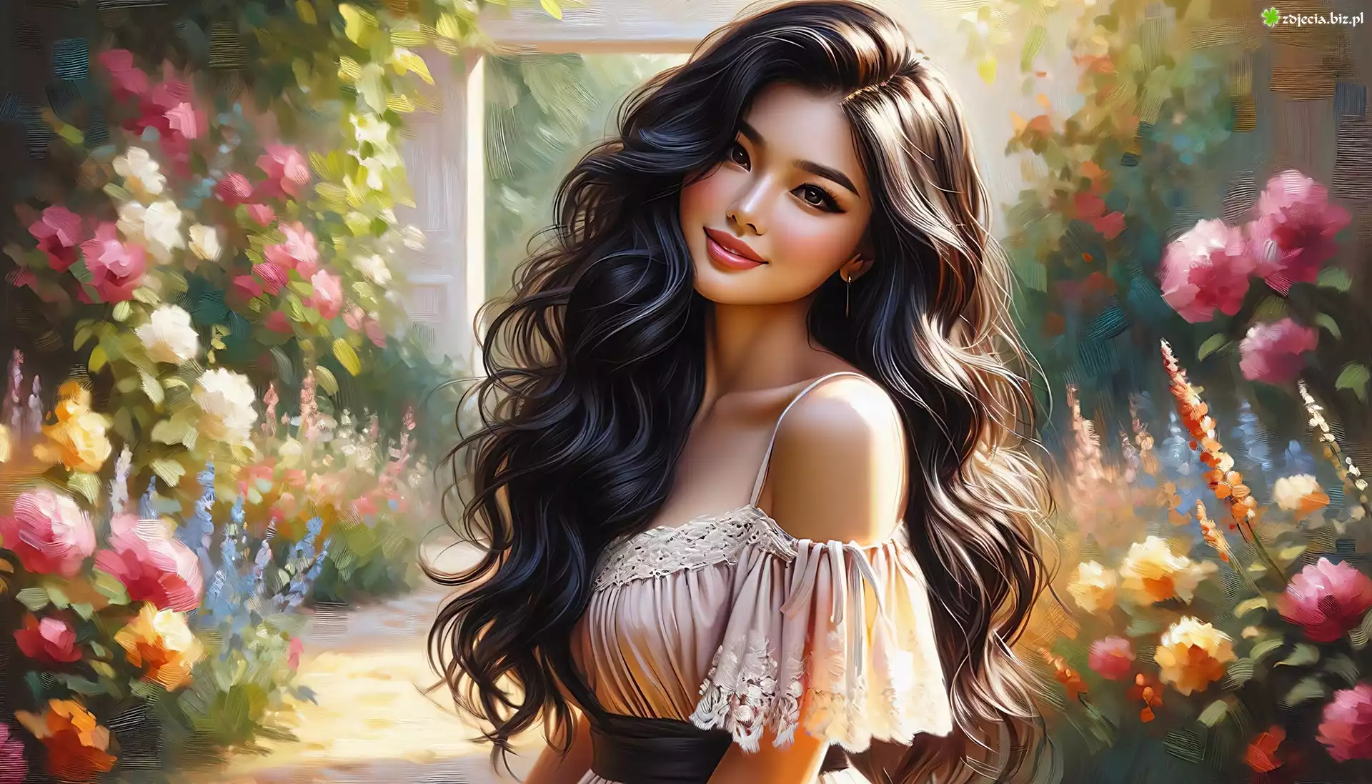Zdjęcie Kobieta, Uśmiech, Ogród, Kwiaty, Grafika