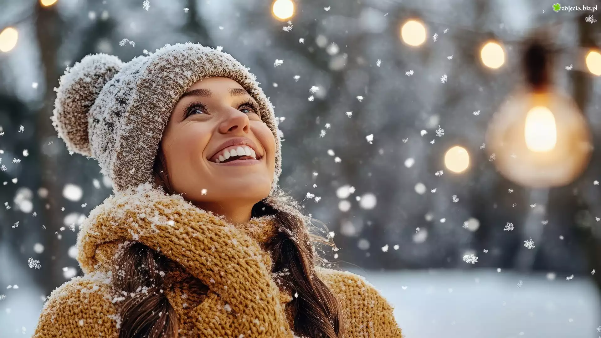 Zdjęcie Kobieta, Długowłosa, Szatynka, Uśmiech, Śnieg, Czapka, Szal
