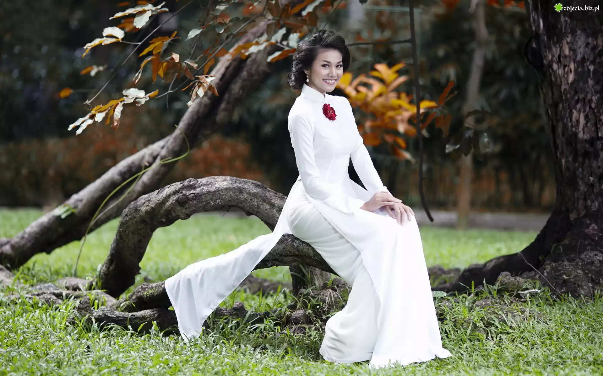 Zdjęcie Uśmiechnięta, Brunetka, Park, Drzewa, Jesień