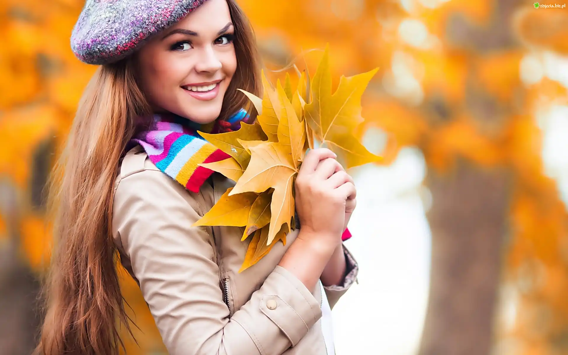 Zdjęcie Uśmiechnięta, Dziewczyna, Bukiecik, Jesiennych, Liści, Park