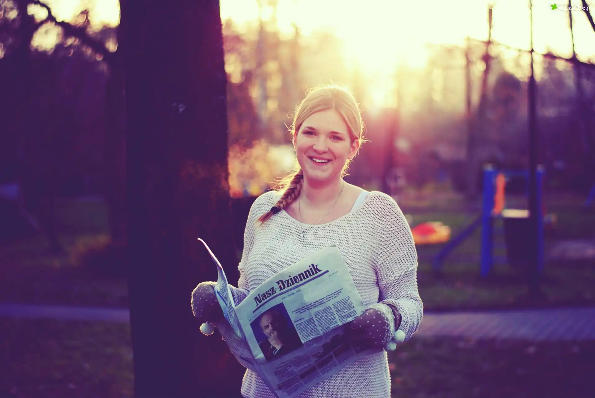 Zdjęcie Uśmiechnięta ,Kobieta, Blondynka, Rękawiczki, Gazeta