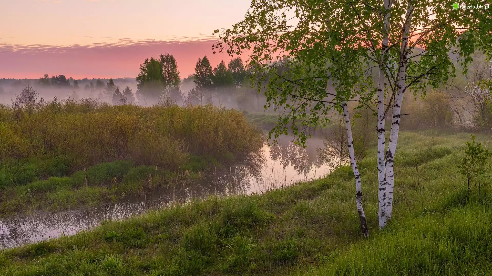 Zdjęcie Rzeka Uzola, Brzozy, Mgła, Trawa, Obwód niżnonowogrodzki, Rosja