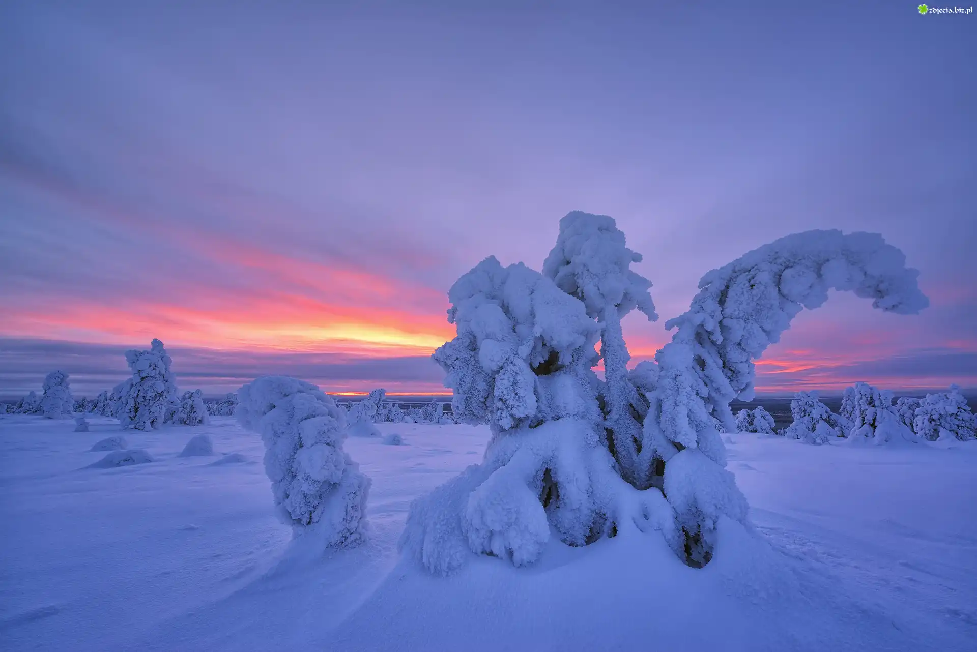 Zdjęcie  Rezerwat Valtavaara, Zima, Drzewa, Mgła, Wschód słońca, Wzgórze, Laponia, Finlandia