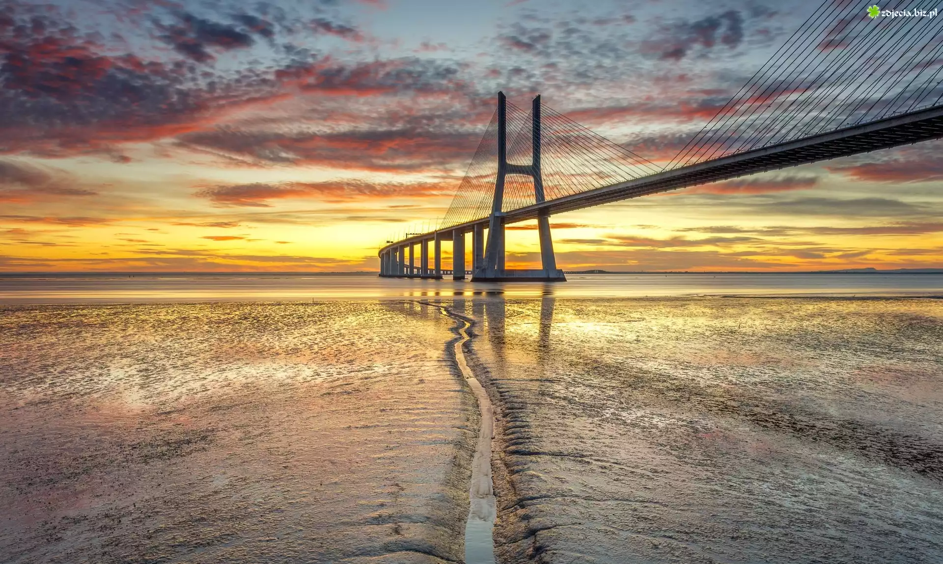 Zdjęcie, Rzeka Tag, Chmury, Zachód słońca, Most, Vasco da Gama, Lizbona, Portugalia